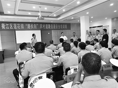 对此,该镇经过调研分析,于9月开始探索实施农村道路交通安全治理“路长制”,创新提出“2+6+23”模式。据悉,莲花镇成立了“路长制”领导小组,由镇党委副书记、镇长担任组长,分管交通的副镇长任副组长,全面负责协调交通安全重大事项。全镇设总路长(辅警)2名,路网交通协管员(分片路长)6名,村级交通协管员(各村路长)23名,最终形成交警、辅警管理监督路长,路长管理监督协管员的管理机制。