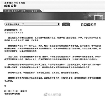 香港教育局11月13日发布消息称,因当前及可预计的状况,及全港学校的整体汇报,全港学校(包括幼稚园、小学、中学及特殊学校)将于11月14日停课。发言人表示,香港社会连日受到暴力示威者广泛破坏,情况令人齿冷;教育局强烈呼吁示威者立即停止所有暴力行为,尽快让学生安全上学。