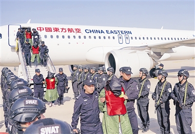 11月14日,在石家庄国际机场,犯罪嫌疑人被河北警方押解下飞机。