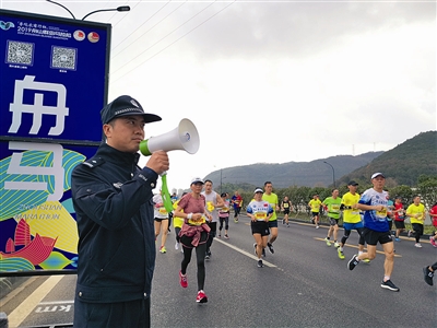 11月17日上午7时30分,2019舟山群岛马拉松赛鸣枪开跑,来自国内外的万余名选手迎着东海的第一缕阳光,一起冲出起点门,奔向终点。为确保马拉松赛事顺利进行,舟山市公安局投入2000余名警力,在赛道的各个点位维持现场秩序,认真做好赛事安保执勤工作。