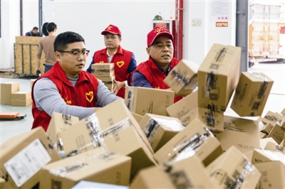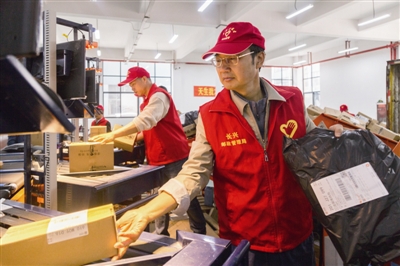 | 今年“双十一”期间,在长兴县星网快递自动化分拣场地上,由长兴县邮管局党员们组成的红马甲志愿服务队来到寄递一线,协助快递企业应对进出港高峰期。通讯员 章梦弦 |