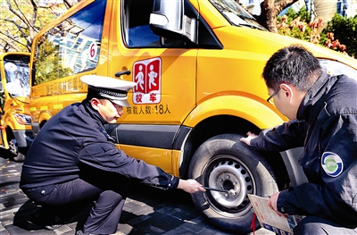 11月28日,上海市公安局静安分局交警支队民警在检查校车轮胎。