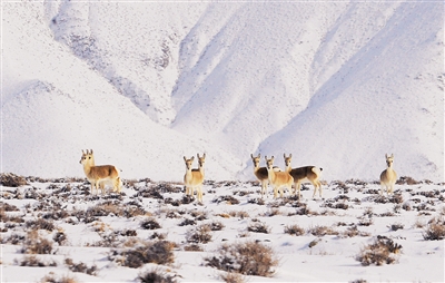 近日,位于祁连山西部的甘肃省酒泉市阿克塞哈萨克族自治县哈尔腾草原迎来降雪。大地银装素裹,生活在这里的野生动物四处觅食。