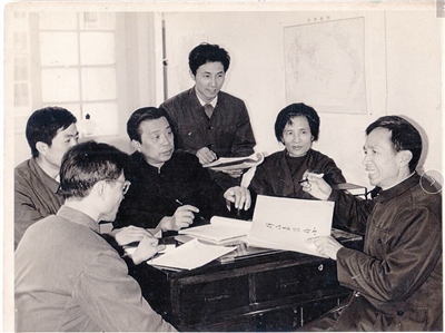 | 1981年12月4日,杭州市法律顾问处部分律师一起分析案情。从左到右:李春发、魏建新、曹星、王志建、傅琪英、袁显明。 |