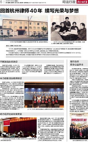1979年,我国律师制度恢复重建。同年12月,杭州市重建“杭州市法律顾问处”,办公地址位于柳营路4号,是全国最早恢复组建律师机构的城市之一。40年弹指一挥间,杭州律师业从无到有、由弱到强,走过了辉煌的发展历程。