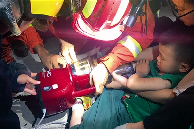 当晚21时10分左右,义乌市消防救援支队119指挥中心接到报警称,苏溪镇同春村有一小孩的手被榨汁机裹进去了,动弹不得。21时20分,救援人员到达现场。“小男孩整个右手掌卡在榨汁机的机身和旋转刀片之间,隐约可见掌心处肉被削开。”救援人员看着都心疼,他们利用磨光机小心翼翼地对机身进行多点切割。经过近20分钟的“精雕细磨”,男孩的手掌终于被成功取出。家人随即将孩子送往就近的医院治疗。经治疗,孩子手掌已缝合包扎,未伤到骨头。