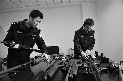昨日,民警正在清点近期缴获的枪支和零部件。
