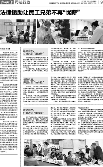 一年来,浙江持续深化农民工申请法律援助“最多跑一次”,开通法律援助维权绿色通道,对农民工请求支付劳动报酬、工伤赔偿及解决劳动保障、社会保险、劳动合同纠纷等事项一律免除经济状况审查;对情况紧急,可予以先行受理;对初步判断符合法律援助条件,但缺少务工、欠薪的部分事实证据材料的,可采取信任在先予以受理,由农民工事后补充相关材料。再加上浙江政务服务网、“浙里办”APP、12348浙江法网、支付宝城市服务、“浙江法律援助”微信小程序、浙江公共法律服务人工智能自助机等在线平台,农民工申请法律援助的渠道更畅通、流程更简化、审批更高效。
