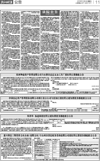 中国信达资产管理股份有限公司浙江省分公司与沈如江债权转让通知暨债务催收联合公告