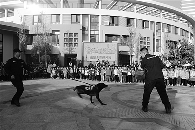 近日,临海市大洋派出所民警走进辖区学校,为师生上安全教育公开课。图为精彩的警犬表演。
