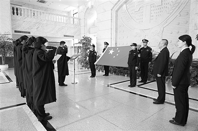 近日,海宁市法院举行了新入额法官及部分新任职干部的宪法宣誓仪式。国歌奏响后,7名员额法官右手握拳、面向国旗作出庄严承诺。通讯员 海薇 摄