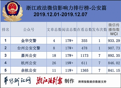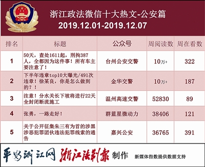本期公安榜,“金华交警”依旧霸榜,“台州公安交警”“嘉兴公安”紧随其后。热文榜上,“台州公安交警”的《50天,查处1611起,刑拘387人,全都因为这件事!所有车主要注意了!》和“金华交警”的 《下半年违章top10大曝光/491次违章!徐某良,你是怎么做到的?!》,均获得10万+阅读量。