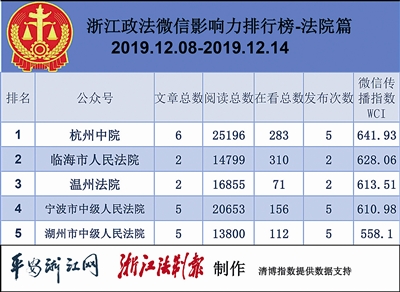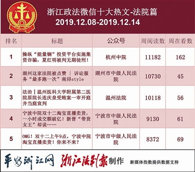 本期法院榜,前三分别是“杭州中院”“临海市人民法院”“温州法院”。热文榜上,有一篇文章引发了不小关注,那就是“宁波市中级人民法院”的《宁波中院双十二淘宝直播卖货,一小时成交额破亿!新晋“带货女王”却说……》,法院“带货”,带的不止是“货”,更是阳光执行的理念、规范执行的机制、公平公正司法的初心。