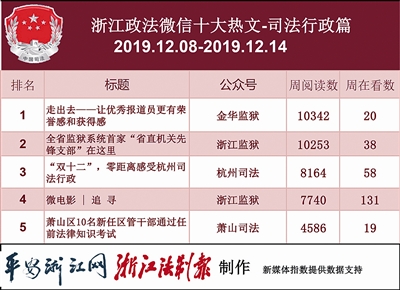 本期司法行政榜,前三分别是“浙江监狱”“金华监狱”“浙江二监”。“金华监狱”的《走出去——让优秀报道员更有荣誉感和获得感》一文登上热文榜首。文章讲述了监狱民警如何提高宣传水平,干货满满。
