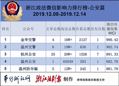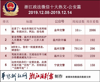 本期公安榜,“金华交警”坐上冠军之位。热文榜上,出现了2篇“10万+”“爆款”好文,分别是“金华交警”的《定责了!电动车闯红灯与宾利相撞,车损20万。网友:没毛病》和“温州防诈骗”的《紧急预警:温州多家医院的医护人员遭遇“洗脑”,已多人被骗!》。