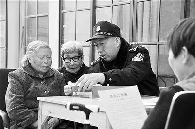 针对临近年关,保健品诈骗高发的特点,近日,临海市大洋派出所民警走入社区,向老人宣传保健品知识,防止受骗上当。图为民警向老人传授非处方药与保健品的识别方法。