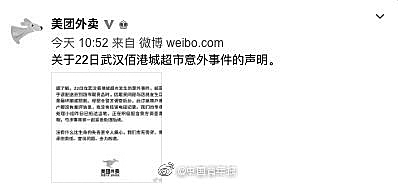 12月23日中午,@美团外卖(北京三快在线科技有限公司)发布了关于22日武汉佰港城超市意外事件的声明。声明称,事件起因于该配送员到超市取货品时,与店员发生口角,最终酿成悲剧。经配合警方调查后台,此订单商户用户都没有差评信息,也没有投诉电话记录。