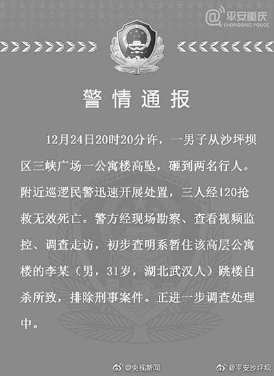 12月25日,@平安沙坪坝(重庆市公安局沙坪坝区分局官方微博)通报:12月24日20时20分许,一男子从沙坪坝区三峡广场一公寓楼高坠,砸到两名行人,三人经120抢救无效死亡。警方初步查明系李某(男、31岁、湖北武汉人)跳楼自杀所致,排除刑事案件。