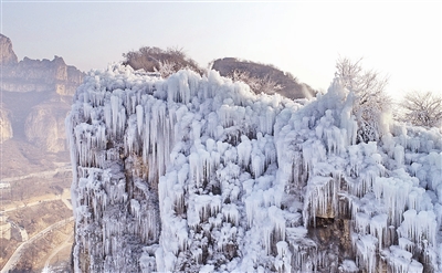 这是平山县沕沕水景区的冰瀑(12月25日无人机摄)。