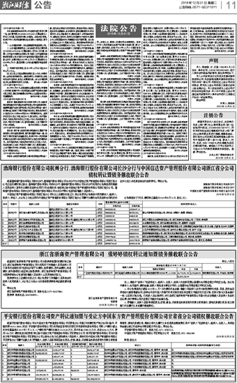 渤海银行股份有限公司杭州分行、渤海银行股份有限公司长沙分行与中国信达资产管理股份有限公司浙江省分公司 债权转让暨债务催收联合公告