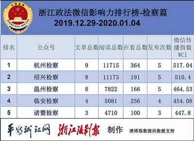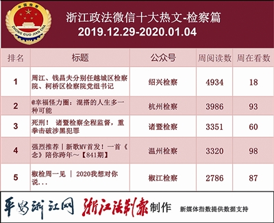 本期检察榜,前三分别为“杭州检察”“绍兴检察”“温州检察”。其中“绍兴检察”的《周江、钱昌夫分别任越城区检察院、柯桥区检察院党组书记》一文拿下热文榜榜首。