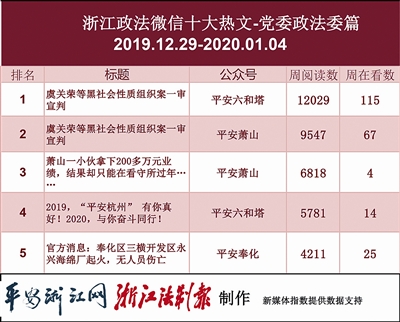 本期政法委榜单,“平安六和塔”在激烈的竞争中取得第一,其《虞关荣等黑社会性质组织案一审宣判》一文更是拿下热文榜第一的位置。看来,扫黑除恶一直都是人们关注的热点话题。