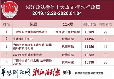 本期司法行政榜,“金华监狱”登顶影响力榜,“杭州司法”也冲上了榜单第二。热文榜中,冠军则是“浙江省十里坪监狱”的《一封来自民警家属的感谢信》一文,监狱民警自发组织献血为同事的父亲渡过难关,这是十里坪监狱“家文化”的生动实践,更是民警队伍建设成果的别样画卷。