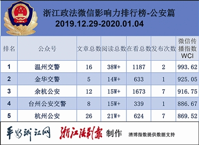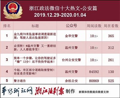 本期公安榜,共有3篇“10万+”热文产生,话题都和道路安全有关。热文榜第一名是“金华交警”的《金九线70米坠崖事故调查最新进展:驾驶人说出坠崖原因!》,文章讲述了一起由酒驾引发的车祸。临近春节,也提醒各位司机喝酒不开车、开车不喝酒。