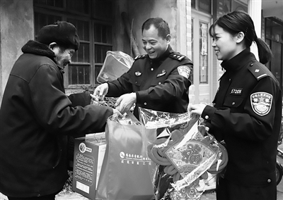 近日,临海市公安局涌泉派出所民警带着食用油、大米等生活用品看望慰问辖区孤寡老人,并为老人现场测量血压、贴春联、挂灯笼,送上新春的祝福。民警详细了解老人的身体状况和生活情况,提醒他们要注意用火用电安全,平平安安过个幸福年。通讯员 郭婷婷