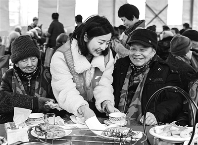 1月15日,志愿者岑益冬(中)在为老人整理碗筷。