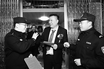 由于婚礼礼金被盗案件时有发生,1月16日下午,临海市公安局杜桥派出所民警来到辖区几家婚礼现场,给新人送上“防盗喜帖”。通讯员 叶明銮 摄