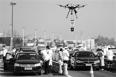 2月20日,嘉兴市秀洲区公安分局巡特警大队利用警用无人机搭载喊话器、摄像头,在常台高速王江泾省际防疫检查点巡航喊话,提请即将进入浙江的车主,提前准备好健康码和身份证。和以往巡航不同的是,这次无人机上还挂着一个健康码申领二维码,车主可以从低空悬浮的无人机上直接扫二维码申领健康码,快检快过,大大提升了通行效率。