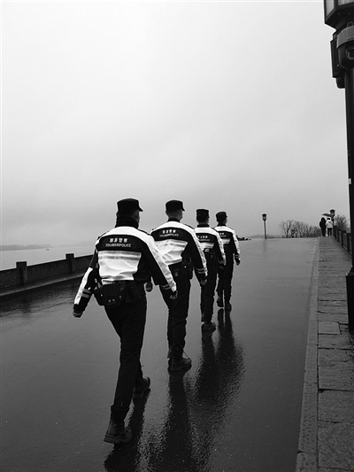 3月1号的西湖,细雨蒙蒙。穿着荧光绿背心的景区公安分局景安巡逻队也成了风景,一组四名年轻民警整齐列队,在西湖景区各个景点巡逻。