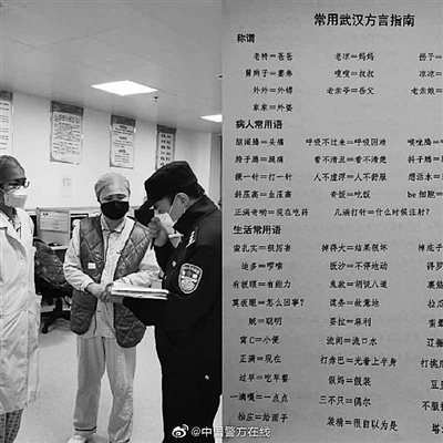 由于地域差异,许多外地支援武汉的医护人员对武汉方言理解有偏差,而病人不少是武汉本地人,说话热辣直接,碰到有些急性子的武汉患者,免不了误以为这些患者“情绪过激”。驻守光谷同济医院30多天的民警曹奕发现,好多外地医生、护士都遇到过这种误会。比如,“这个护士好贼”,其实意思是夸奖护士很聪明能干,并不是“小偷”的意思;“这名医生真耍拉”,其实是说医生干事爽快麻利,并不是耍赖。曹奕于是整理了《常用武汉方言指南》小册子,并“现场授课”。拿到《指南》的医护人员抿嘴笑半天。曹奕说,之所以笑,是因为在与患者接触时,医护人员确实都曾听到过,如今看到注释,他们也感觉到武汉人真的蛮热情。