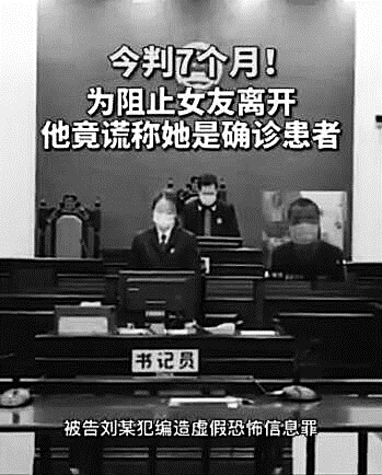 一名男子为了拖延时间挽留女友,竟然编造女友是确诊新冠肺炎患者的虚假信息,造成广州市及相关部门启动应急预案,浪费社会与警务资源,扰乱社会秩序。3月9日上午,本案在广州市海珠区法院公开开庭审理并当庭宣判,被告人刘某当庭悔罪痛哭。因犯编造虚假恐怖信息罪 ,刘某一审被判处有期徒刑7个月。