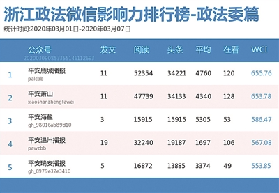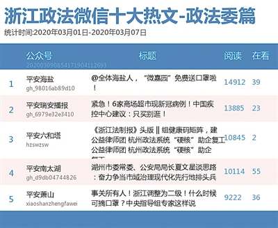 本期党委政法委榜单,“平安鹿城播报”“平安萧山”“平安海盐”名列前三。热文榜上,“平安海盐”的《@全体海盐人,“微嘉园”免费送口罩啦!》获热文榜第一名。再次提醒大家,疫情尚未结束,切勿放松警惕,出门记得戴口罩。
