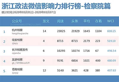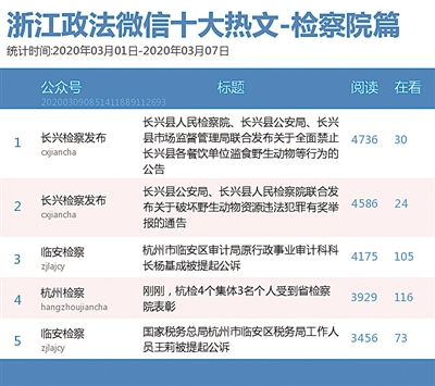 本期检察院榜单,“杭州检察”荣登榜首,亚军“临安检察”、季军“长兴检察发布”WCI指数相差较少,综合实力较为接近。热文榜上,“长兴检察发布”的《长兴县人民检察院、长兴县公安局、长兴县市场监督管理局联合发布关于全面禁止长兴县各餐饮单位滥食野生动物等行为的公告》《长兴县公安局、长兴县人民检察院联合发布关于破坏野生动物资源违法犯罪有奖举报的通告》,两篇文章均与野生动物有关,并分获第一、第二名。