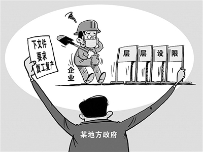 日前,一些非疫情防控重点地区的企业反映,当地政府部门仍在给企业复工复产设置不切实际、过于苛刻的要求。比如,一些没有报告疑似病例和确诊病例的地方却要求建筑工地在复工前除准备好口罩消毒液外,还要准备防护服;有的地方复工复产审批表格不停更换,报上去的表格被多次打回重填。地方政府一方面下文件要求复工复产,另一方面层层设限,这让企业左右为难。