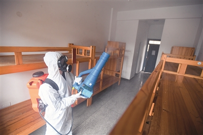 3月12日,在长沙市长雅中学,工作人员对学生宿舍进行消毒。