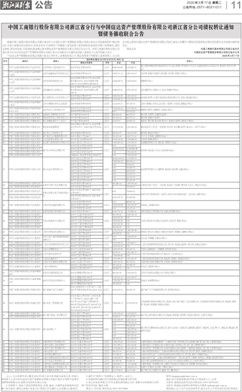中国工商银行股份有限公司浙江省分行与中国信达资产管理股份有限公司浙江省分公司债权转让通知 暨债务催收联合公告