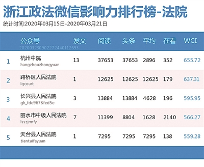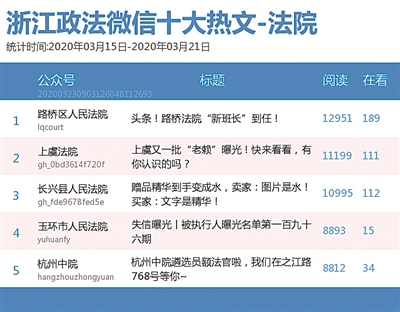 本期法院榜,“杭州中院”仍稳坐榜单第一。“路桥区人民法院”的《头条!路桥法院“新班长”到任!》拿下热文榜第一,据悉,该院迎来了新的“领头人”,大伙儿纷纷来围观。