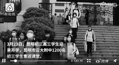 3月23日,昆明初三高三学生迎来开学,学生戴口罩开学。云大附中初三学生表示开学超开心,感觉学校空气更好。据校医介绍,学校做好了充足准备,来确保学校安全开课,而学校第一课就是校医专家医师讲解防疫知识。