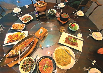 | 在“徽公馆”饭店内,一桌已经被全部摆上公筷、公勺的饭菜 |