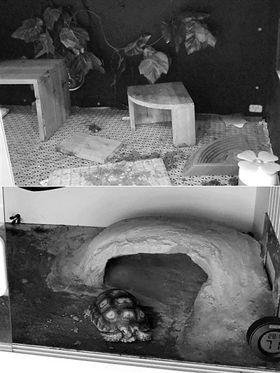 31岁的陈某是个养龟发烧友,陆续养了苏卡达陆龟、豹纹陆龟、红腿陆龟等品种,总共10只。由于陆龟对环境温度的要求十分苛刻,陈某特地为家中的乌龟买来恒温箱等一应物品。陈某为乌龟布置了非常温馨的“家”:生态龟缸里点缀着些许绿植,5只陆龟在土坡上缓缓爬行,陈某担心乌龟寂寞,还放置了一只假龟加以陪伴。一旁,5只水龟和金鱼一同在水缸中徜徉。