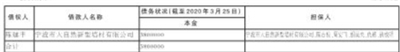 | 公告清单 单位:元 注: 1.清单中“担保人”包括保证人、抵押人、出质人,担保人的担保范围以签署的合同等法律文件约定为准。如公告中债务人、债权金额、担保人等信息与事实不符的、以及遗漏的,以签署的合同等法律文件约定为准。 2.本公告清单仅列示截至2020年3月25日24时的借款本金余额,借款人与担保人应支付给冯雪庆的利息、复利、律师费及其他应付款按借款合同、担保合同及(2012)甬镇商初字第718号民事判决书确定的方法计算。 3.若借款人、担保人因各种原因更名、改制、歇业、吊销营业执照或丧失民事主体资格的,请相关承债主体或清算主体代为履行义务或履行清算责任。 |