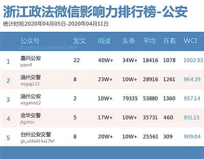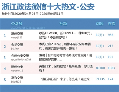 本期公安榜上,前三分别是“嘉兴公安”“温州交警”“温州公安”。热文榜上,有3篇阅读量达10万+的好文,位于榜首的是“温州交警”发布的《@浙C1W888、浙CJ2V11…一律100元,记2分!不会有你吧?》。