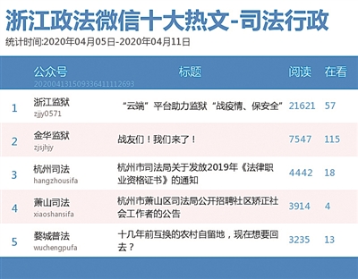 本期司法行政榜上,“浙江监狱”荣登榜首,“金华监狱”“杭州司法”紧随其后。“浙江监狱”发布的《“云端”平台助力监狱“战疫情、保安全”》,夺热文榜冠军。看来,读者们对监狱如何运用高科技加强防控、监管工作颇为关注。