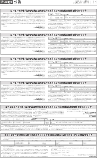 浙江法制报 公告 00011 中国长城资产管理股份有限公司浙江省分公司对东阳市永福杯业有限公司等2户企业债权处置公告 2020-04-14 2 2020年04月14日 星期二