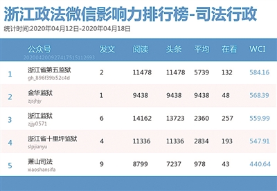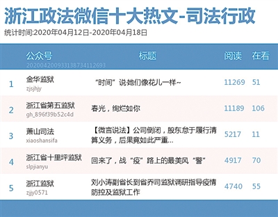 本期司法行政篇,“浙江省第五监狱”表现优异,夺得冠军。热文榜中,“金华监狱”的《“时间”说·她们像花儿一样》排名第一,“浙江省第五监狱”的《春光,绚烂如你》紧随其后,两文均讲述了战“疫”中监狱民警的故事,甚是感人。