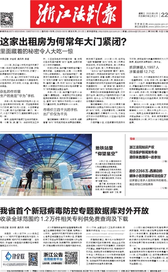 本报讯 4月21日下午,2020年浙江省“4·26”知识产权宣传周在杭州启动,今年的主题是“知识产权与健康中国”。活动现场,我省首个新型冠状病毒防控专题数据库正式对外开放。